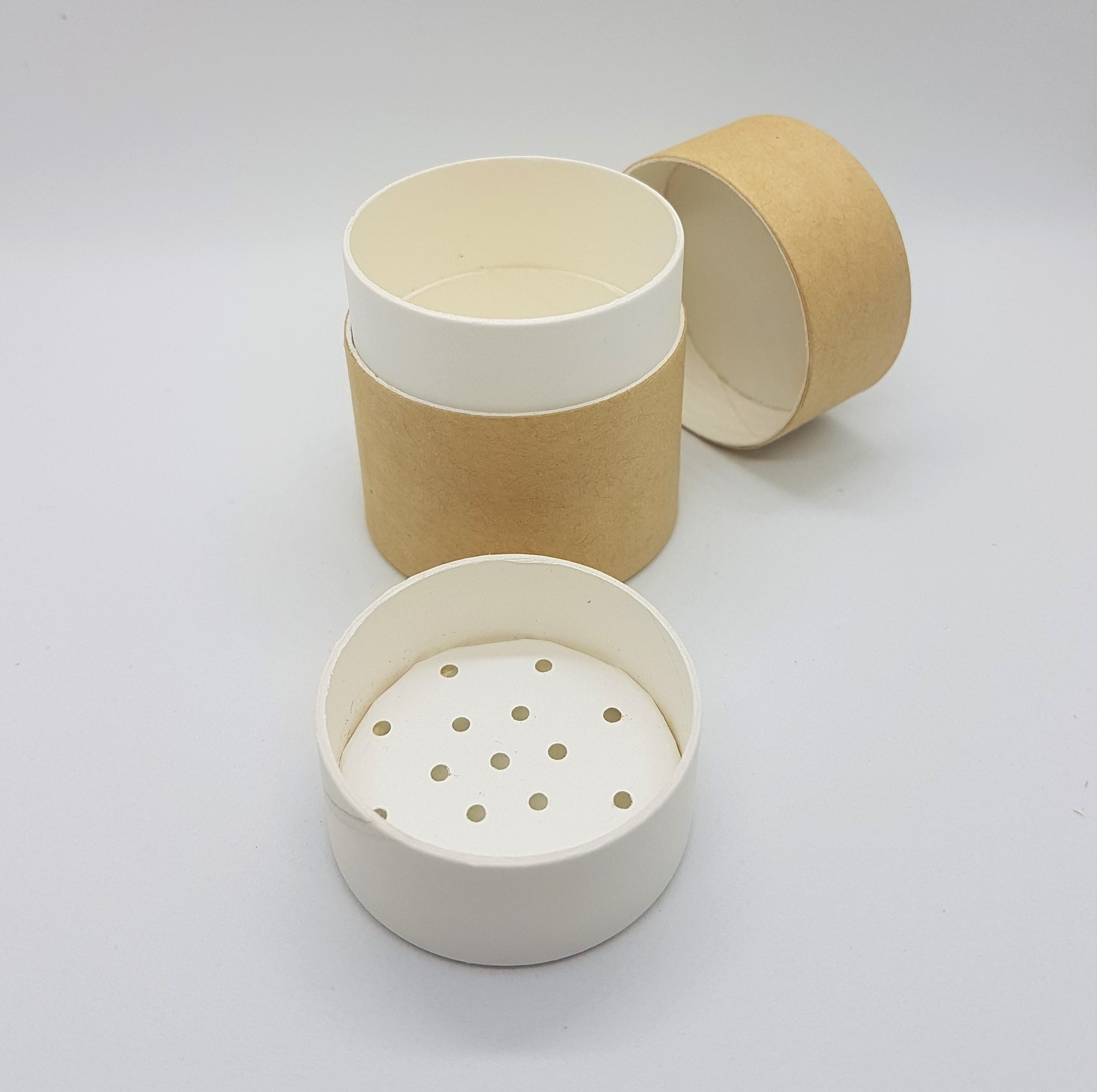 Material: Kraft cardboard | Inner oil resistant paper lining | Cardboard white sifter insert.